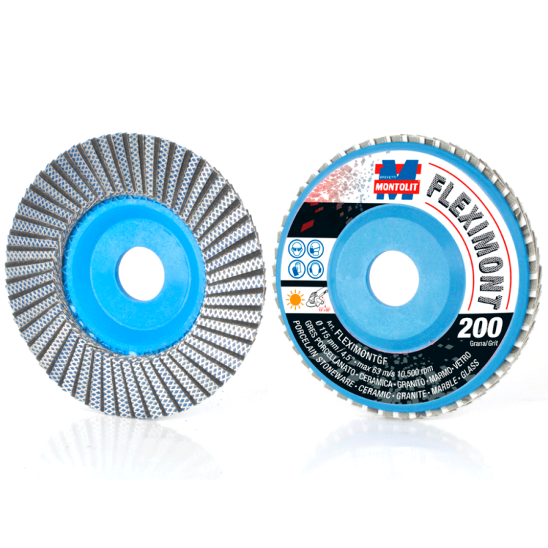 FLEXIMONT GF è un disco diamantato lamellare universale studiato per smussare, levigare, eseguire jolly e modellare gres porcellanato, ceramica, granito, marmo e vetro.
